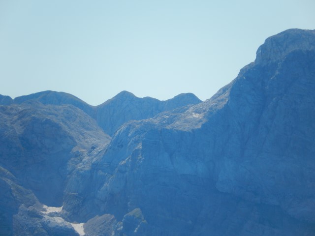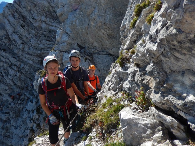 No, nekateri pa itak... kakor smo v Stolu zadnjič videli, da se avstrijci znajo zavarovat in da jim ni težko opreme s seboj vlačit, je bila tule drugačna slika. Bližina Vršiča pač naredi svoje in na poti najdeš neverjetno veliko pogumnežev, ki opravijo s potjo z levo roko in desno nogo. Brez samovaroval in brez čelade. V gručah po tri do pet, večinoma družine. Spredaj šef, ki zna v hribe hodit, zadaj pa - malo starejši - otroci. Da jim pokaže, kako se to dela. In ne nekaj počasi, zanesljivo, če se le da hitro, čim hitreje!