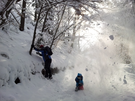 Po sledeh sodeč so neki smučarji zavili direktno dol, nekdo je šel pa tukaj gor. No, mi smo jo udrli dol, pa je bilo presneto strmo! Tamauček je seveda vriskal od veselja, jaz sem tulil, naj bo previden, mami pa se je čudno zdelo, kam midva tako hitiva po taki strmini...
